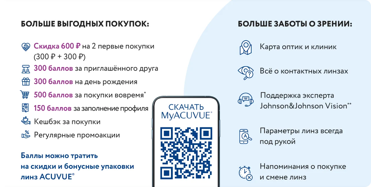 **Скидка 600 руб. предоставляется участникам, зарегистрированным с 08.08.2019, двумя частями по 300 баллов. Активация скидки происходит после подбора контактных линз ACUVUE® в соответствии с правилами Программы.