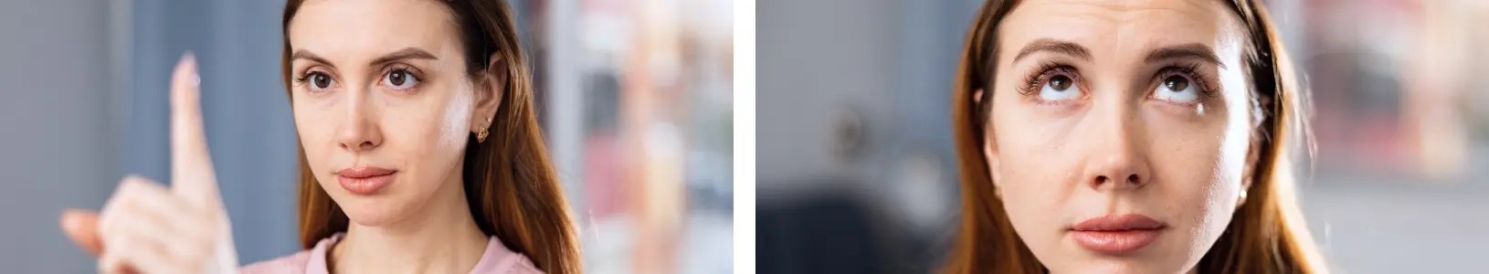Зафиксируйте указательные пальцы над бровями и тяните их вверх. Параллельно старайтесь нахмуриться или зажмуриться.