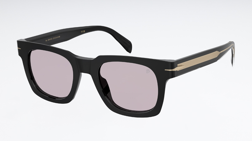 Солнцезащитные очки David Beckham в черной оправе с сиреневыми линзами отлично играют на контрастах.