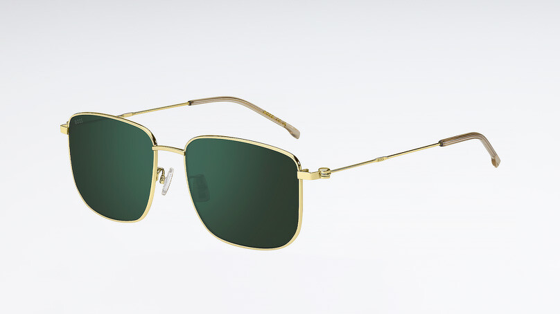 Невероятной глубины линзы, золотая оправа, легкий оверсайз – красивая модель солнцезащитных очков HUGO BOSS.