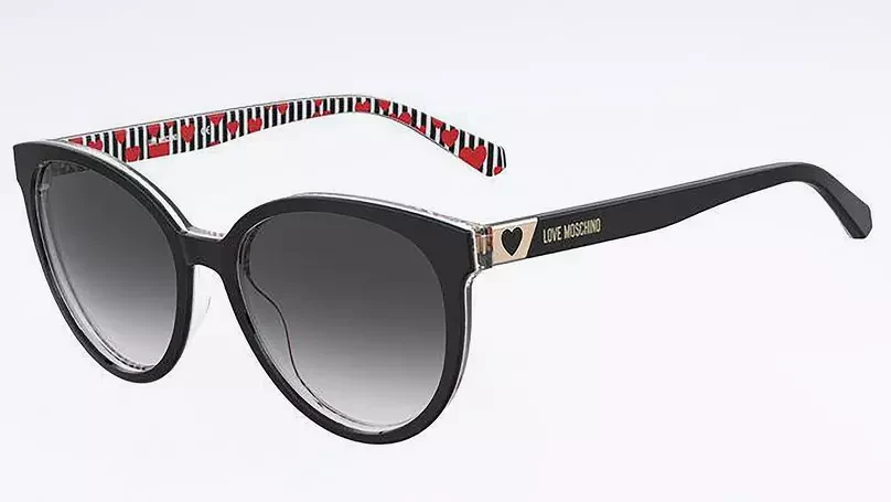 Love Moschino интригует: черные очки-бабочки украшены ярким сердечком на заушнике и дерзким принтом на обратной стороне.