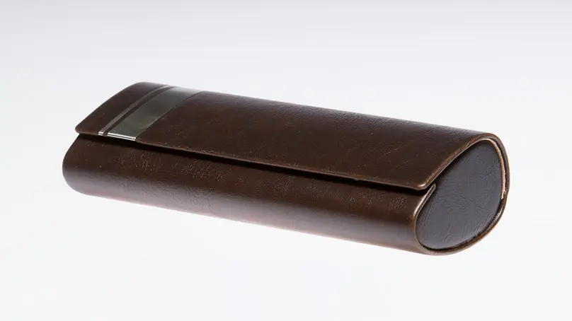 Темно-коричневый футляр для солнцезащитных и корригирующих очков отличается современным дизайном и полностью оберегает их от повреждений.